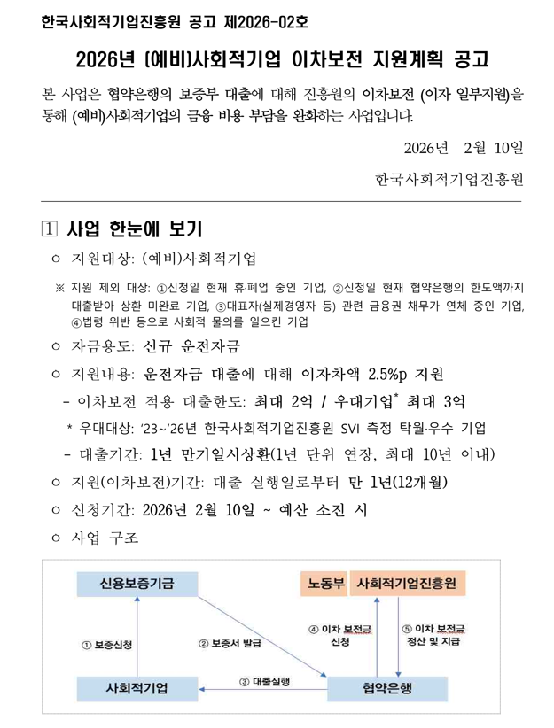 노동부와 진흥원은 2026년부터 (예비)사회적기업 금융비용 경감을 위해 이자차액 일부를 보전하는