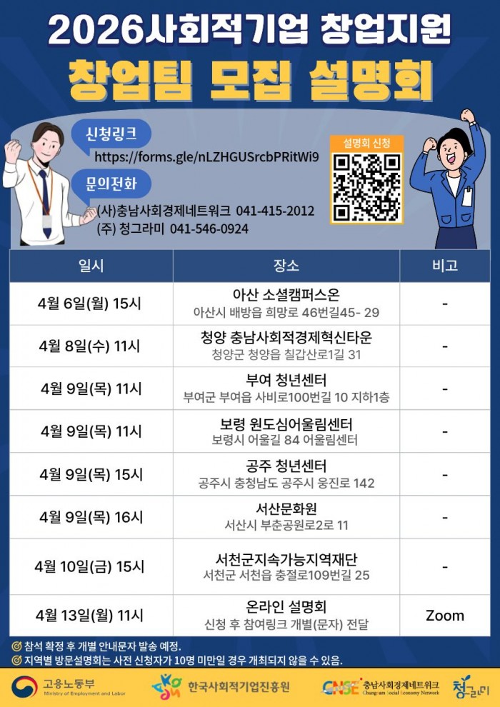안녕하세요. (사)충남사회경제네트워크 입니다. 2026년 사회적기업 창업지원 창업팀 모집 사업공고와 관련하여, 충남지역 설명회를 아래 일정과 같이 진행할 예정이오니 많은 관심과 참여 바랍니다.