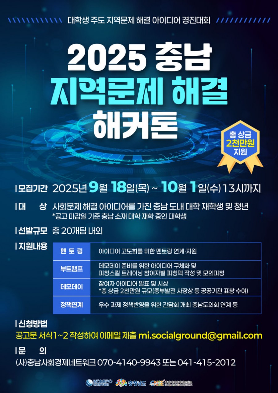 2025 충남 지역문제 해결 해커톤 대회 모집 공고(~10/1(수) 13시까지)