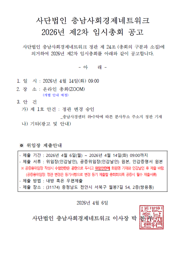 (사)충남사회경제네트워크 2026년 제 2차 임시총회 공고